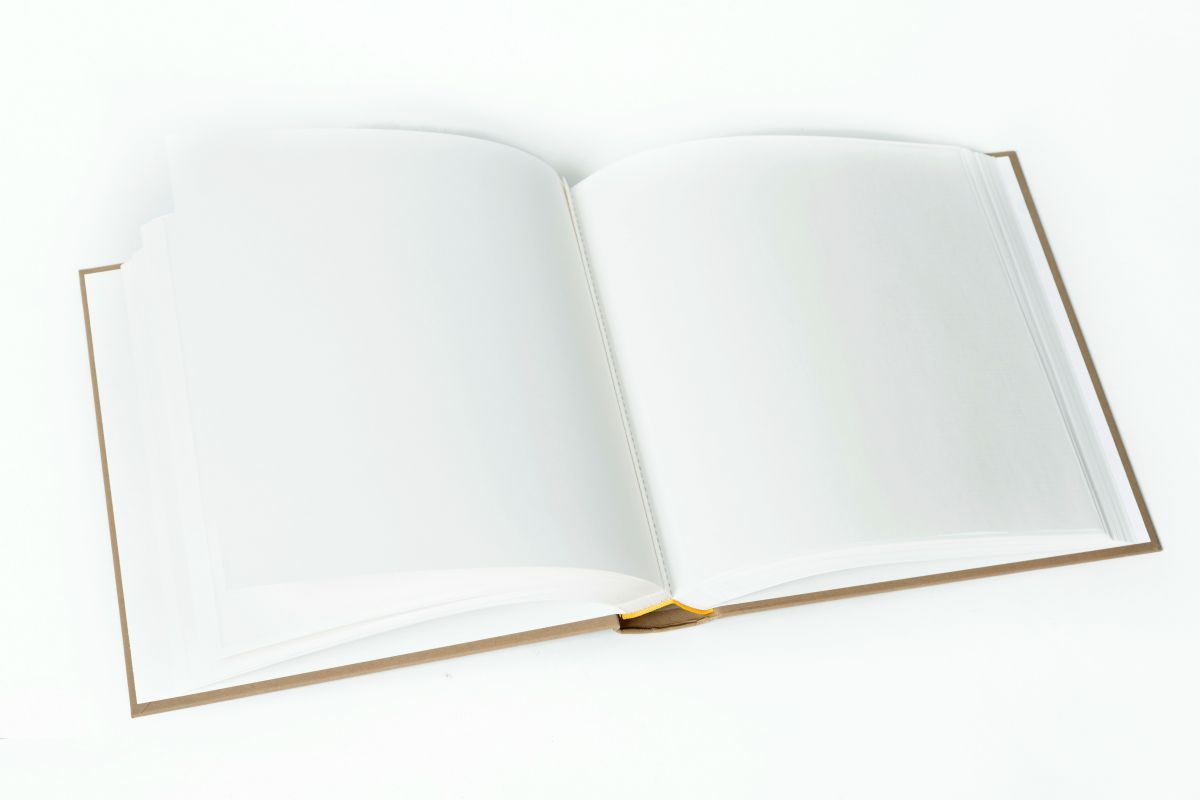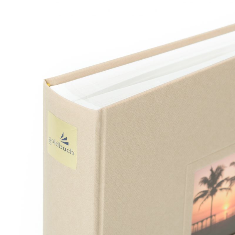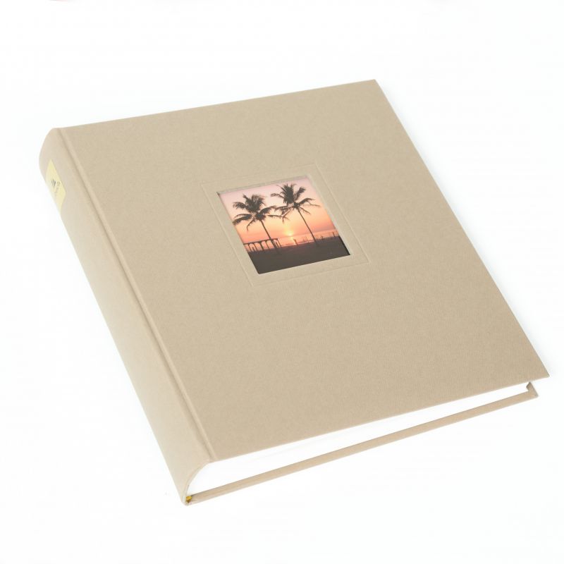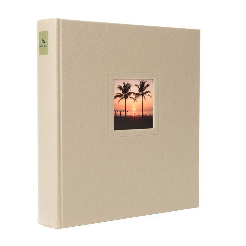 Album tradycyjny w twardej oprawie koloru beżowego, z wraźną fakturą na okładce. W okienku znajdującuym się z przodu można umieścić własną fotografię.