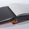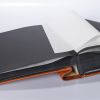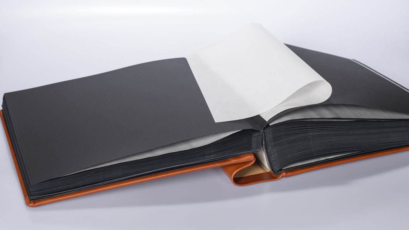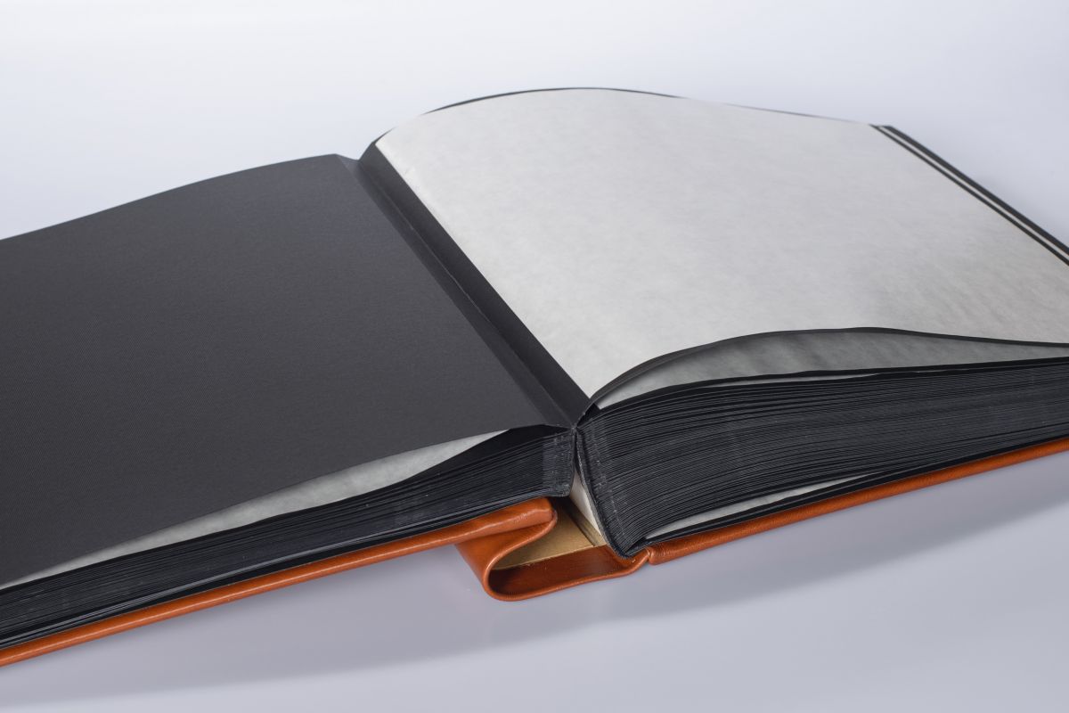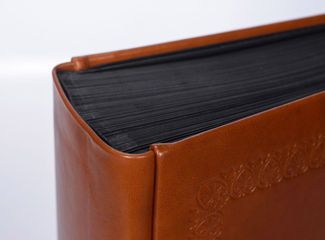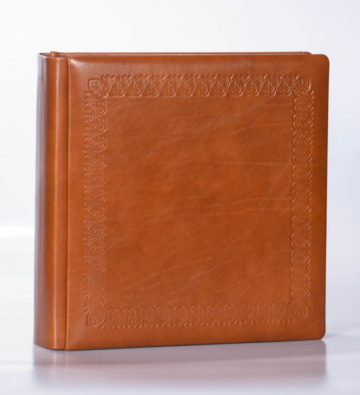 Album wykonany ze skóry naturalnej przez włoskich introligatorów. Oprawa w kolorze jasnego brązu ma przytarcia i niejednolity kolor. Widoczna jest wyraźnie faktura skóry, zdobiona charakterystycznym ornamentem. Album zawiera 100 kart w kolorze czarnym przekładanych białym pergaminem.