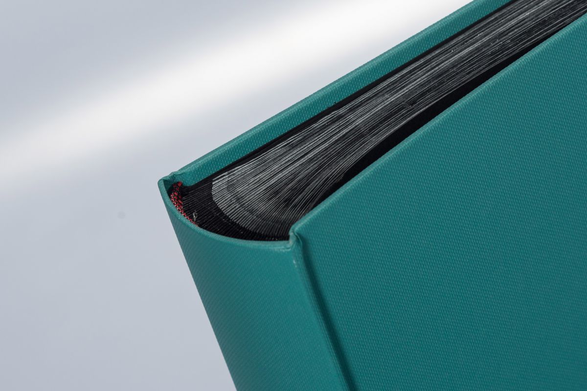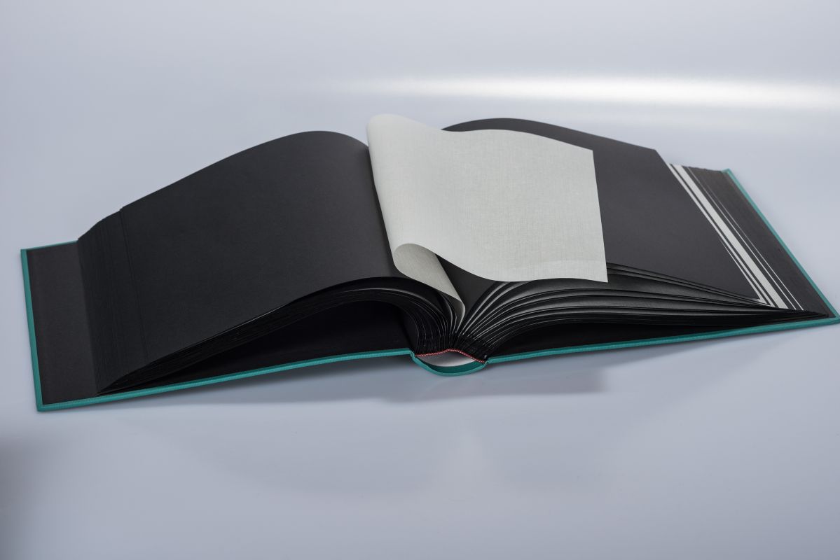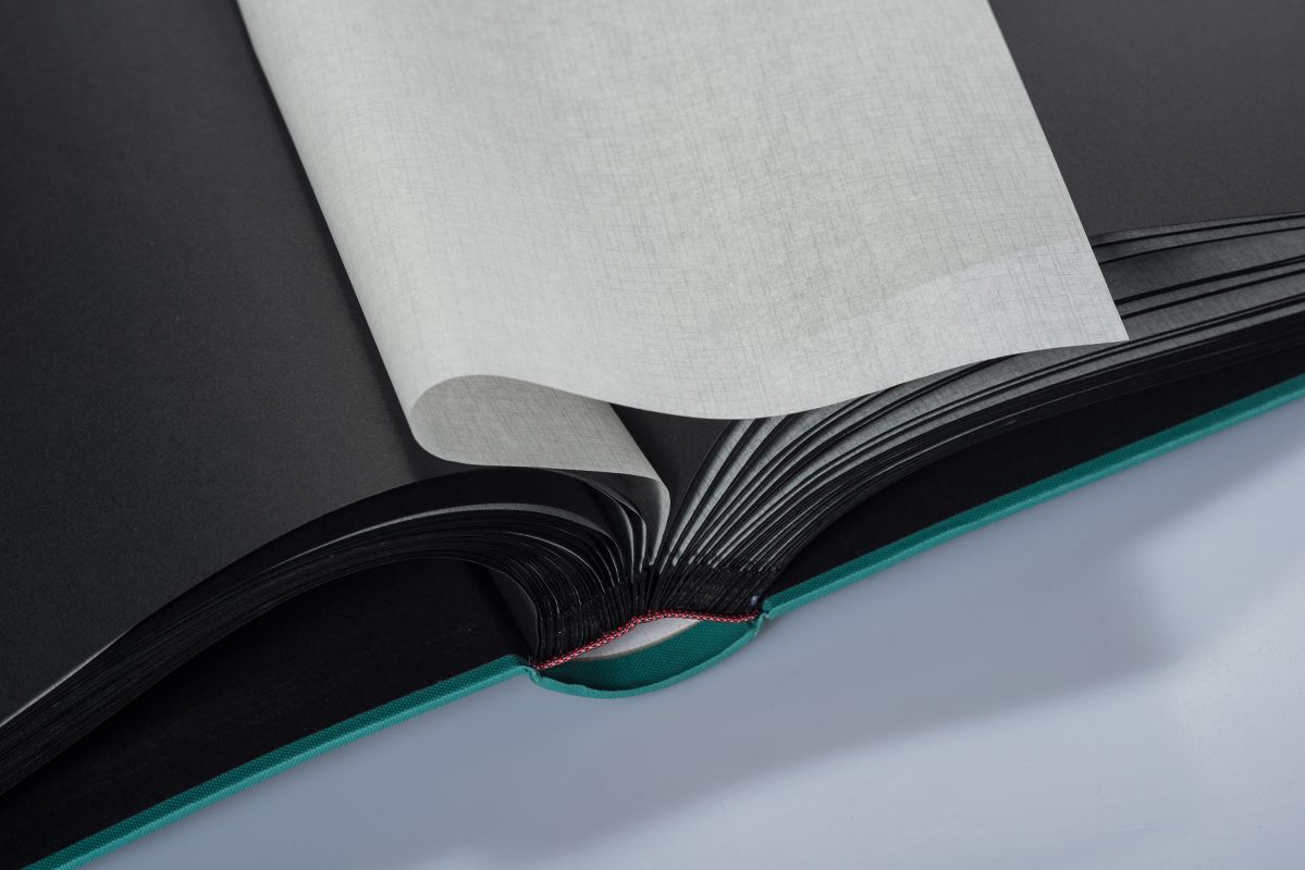 Tradycyjny album na zdjęcia w kolorze morskim w twardej oprawie. Album zawiera 50 kart  w kolorze czarnym oddzielonych od siebie pergaminem.
